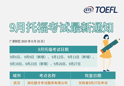 9月雅思托??荚嚽闆r公布!新增考點和場次!2020-09-05 15:00:10