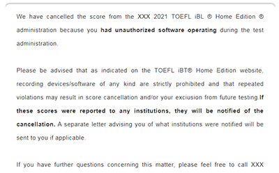 最近不少同學反饋說,自己幾個月1前考的在家托福成績被ETS取消了,根據ETS發的郵件說,理由是:had unauthorized software operating(使用了與考試無關的軟件)。
