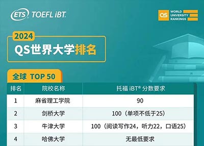 就在上周的時候,2024年2024年QS世界大學排名榜單正式對外發布了,作為今年躋身全球前50的院校來說,其中16所院校來自美國,8所來自英國,6所來自澳大利亞,更有4所來自中國大陸的高校,2024申請季馬上開始,那么這些高校對于雅思和托福的成績要求是多少呢?本期給大家盤點一下。